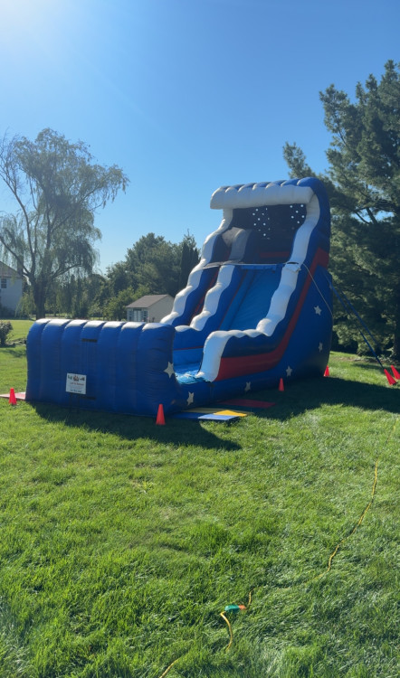 Check out the 18 ft All American Slide, a majestic sight to behold! This awesome inflatable is sure to bring out the patriot it everyone with its classic shades of red, blue, and white alongside the stars that dot the sides of the unit. Fully inflated, it stands over 18 feet tall and includes easy-to-access steps on one side, the spacious slide lane on the other, and safety mesh nets at the top.